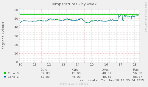 Aber..da war doch was mit Strom? Natürlich frisst jede Hardware, wenn sie nicht im Leerlauf ist, mehr Strom. Ich habe der Berechnung selbst enge Grenzen gesetzt, was die Berechnungen angeht. So werden Berechnungen nur an 3 Tagen der Woche durchgeführt. Und auch dann gebe ich nicht 100 % der Ressourcen frei, um den Stromverbrauch (und Verschleiß) nicht gleich in astronomische Höhen zu treiben. Recht interessant: Trotz deutlich gestiegener Auslastung (rechts, ich bitte den beschädigten Graphen zu verzeihen, ich hatte ein Munin-Problem) geht die Temperatur nur mäßig hoch und bleibt unterhalb meiner „Wohlfühlgrenze“. Wie sich das Ganze auf den Stromverbrauch auswirkt, wird sich zeigen. Hierfür muss ich noch entsprechende Hardware anschaffen.