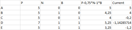 Lets compare this version with a slightly adapted version where negative hits have a slightly higher weight: The resulting order will be A > D > B > C > E.